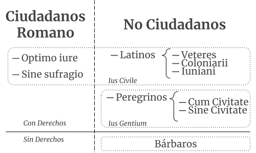Si bien la división más sencilla que se puede hacer respecto a la ciudadanía romana es la de ciudadanos y no ciudadanos, para entender mejor las implicaciones jurídicas que traían los diferentes estatus deberíamos agruparlos en ciudadanía romana, ciudadanía latina y peregrinos.