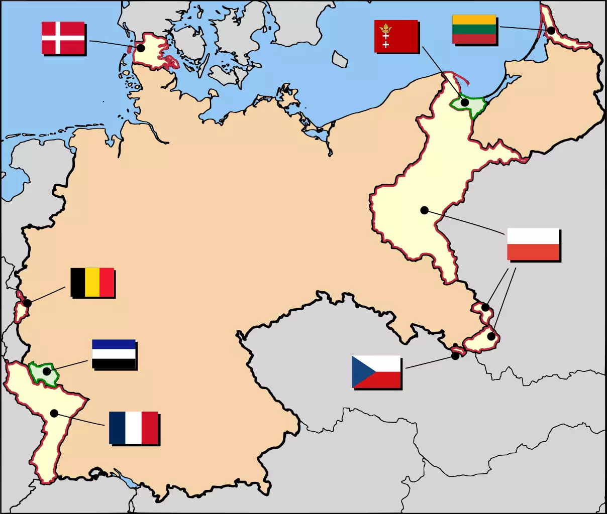En febrero y marzo de 1920 se celebraron los plebiscitos de Schleswig. Al pueblo de Schleswig se le presentaron solo dos opciones: soberanía danesa o alemana. El área de habla danesa del norte votó por Dinamarca, mientras que el área de habla alemana del sur votó por Alemania, lo que resultó en la partición de la provincia. El plebiscito de Prusia Oriental se llevó a cabo el 11 de julio de 1920. Hubo una participación del 90% y el 99,3% de la población deseaba permanecer en Alemania. Se llevaron a cabo más plebiscitos en Eupen-Malmedy y Neutral Moresnet. El 20 de septiembre de 1920, la Sociedad de Naciones asignó estos territorios a Bélgica. Estos últimos plebiscitos fueron seguidos por una comisión de límites en 1922, seguida por el reconocimiento de la nueva frontera belga-alemana por parte del gobierno alemán el 15 de diciembre de 1923. La transferencia del área de Hultschin, de Silesia, a Checoslovaquia se completó el 3 de febrero de 1921.