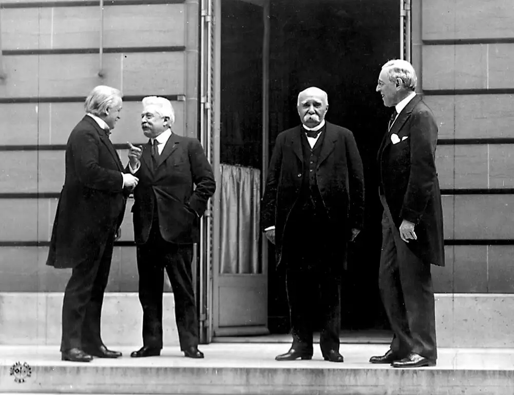 Inicialmente, un "Consejo de los Diez" (compuesto por dos delegados de Gran Bretaña, Francia, Estados Unidos, Italia y Japón) se reunió oficialmente para decidir los términos de la paz. Este consejo fue reemplazado por el "Consejo de los Cinco", formado por los ministros de Relaciones Exteriores de cada país, para discutir asuntos menores. El primer ministro francés, Georges Clemenceau, el primer ministro italiano, Vittorio Emanuele Orlando, el primer ministro británico, David Lloyd George, y el presidente de los Estados Unidos, Woodrow Wilson, formaron los "Cuatro Grandes" (en un momento se convirtieron en los "Tres Grandes" tras la retirada temporal de Vittorio Emanuele Orlando ). Estos cuatro hombres se reunieron en 145 sesiones cerradas para tomar todas las decisiones importantes, que luego fueron ratificadas por toda la asamblea. Las potencias menores asistieron a una "Conferencia Plenaria" semanal que discutía temas en un foro general pero no tomaba decisiones. Estos miembros formaron más de 50 comisiones que hicieron varias recomendaciones, muchas de las cuales se incorporaron al texto final del tratado.